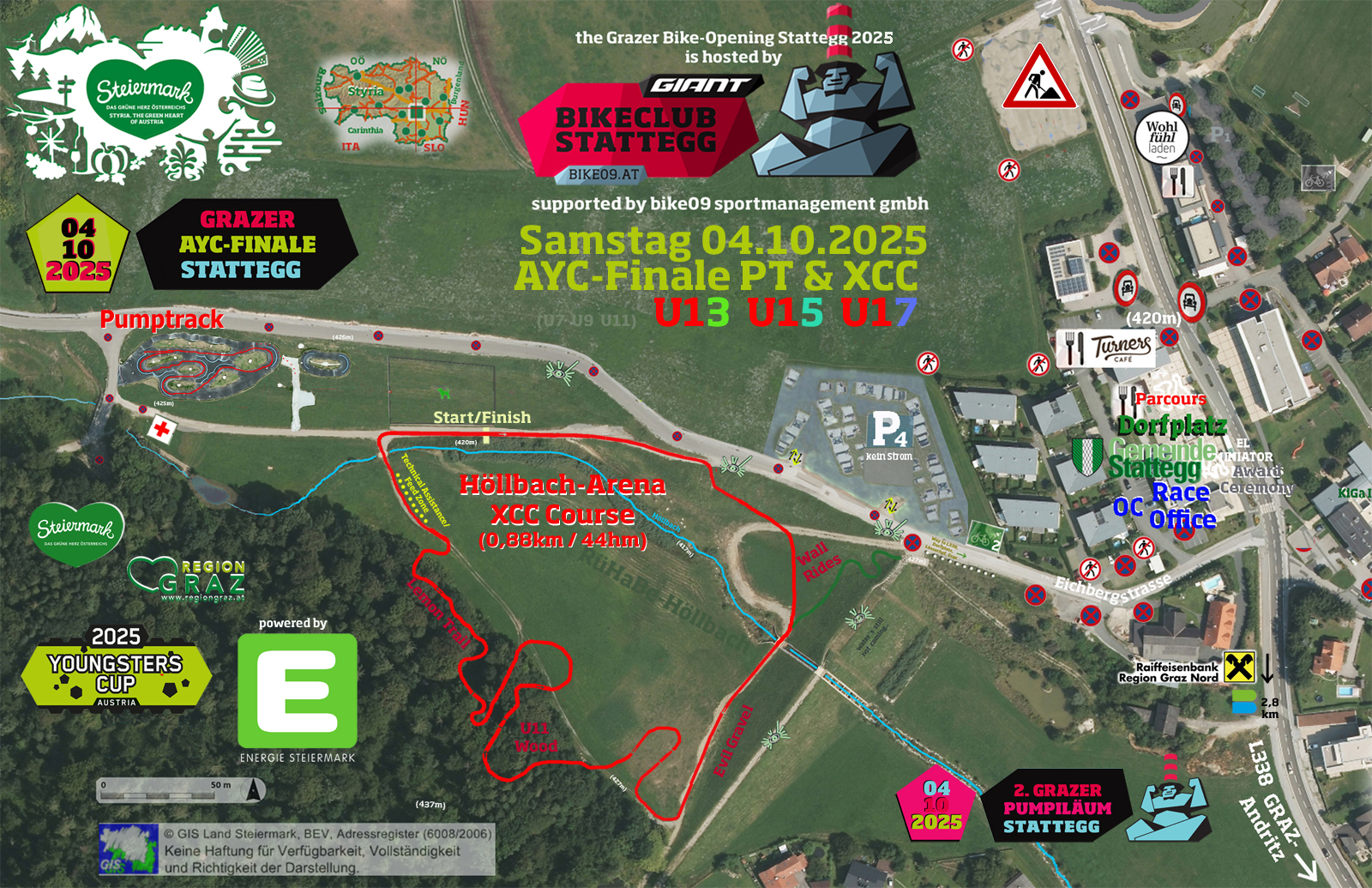 Grazer Bike-Opening Stattegg (5.-12.07.2025: Sa. 05.07. Schöckl Gipfelsturm (KTM MTB Challenge small (22km/1200 hm) classic (55km/2.490hm) So. 06.07. U5-U17 XCO Junior MTB Challenge Mountainbike Junior World Festival 08.-12.07.2025 C1, C2, C3, C3, Team Relay (nur für Junior:innen) Grazer Youngsters-Cup Finale Stattegg: Sa.04.10.2025 2. Pumpiläum featuring BC-Feinkoststandl powered by Jürgen Pail and his Silberrück:innen, Tombola und Spaßparcours 16:00 Uhr Stmk. KIDS CUP Parcoursrennen U5-U11 am Dorfplatz 17:00 Uhr Spaß-Parcoursrennen U13-U99 am Dorfplatz ca. 18:30 Uhr AYC-Finale-Party!!! - im Festzelt mit DJane Yam & DJ BK So.05.10.2025 Dorffest Stattegg including BC-Feinkoststandl: featuring Montasio, Prosciutto und Prosecco powered by Jürgen Pail and his Silberrück:innen, BurgerBrater-FoodTruck,.... |